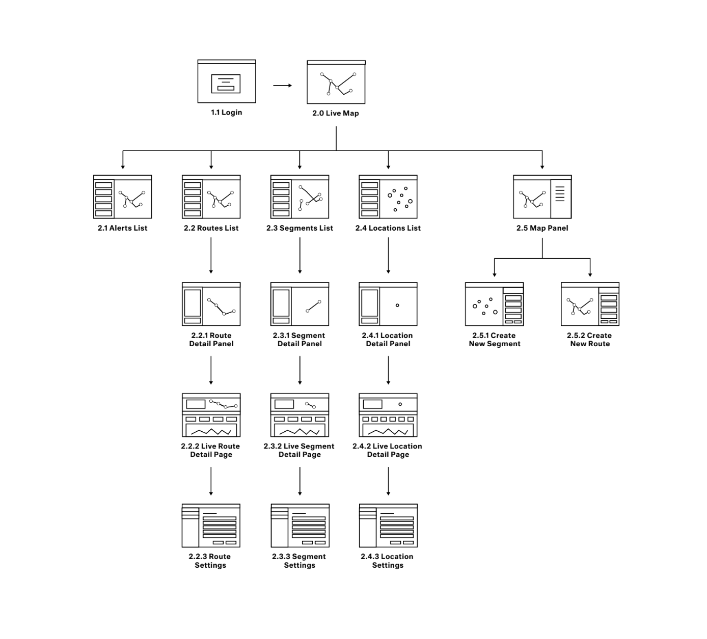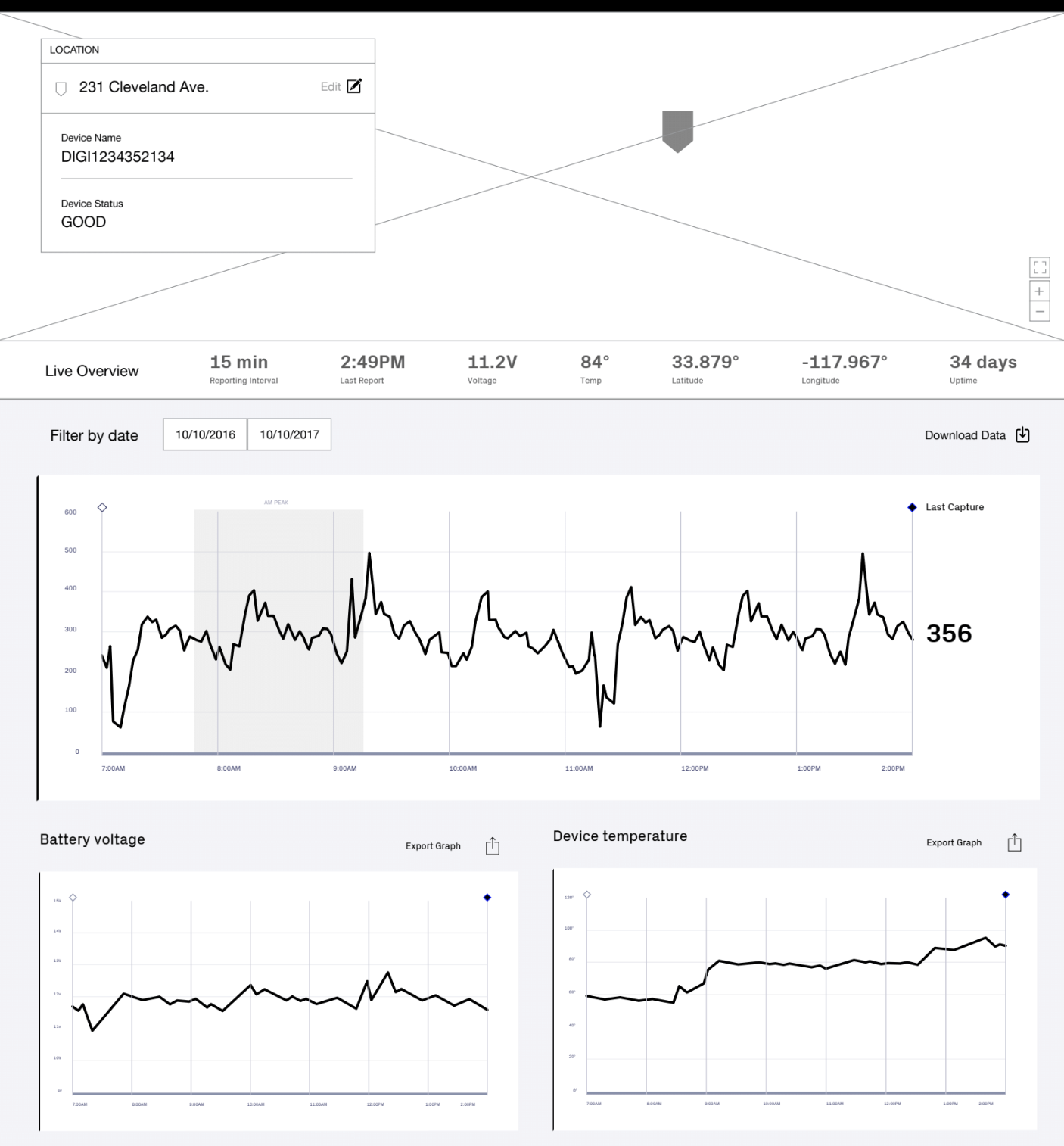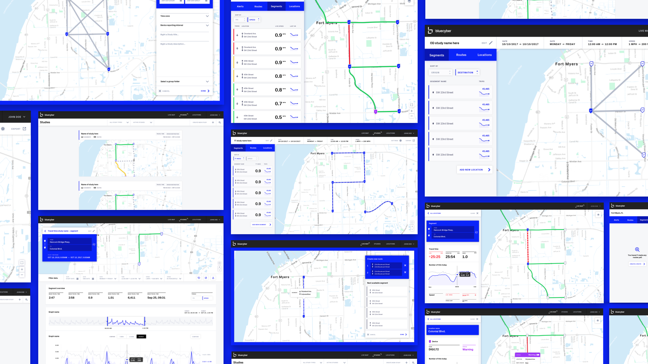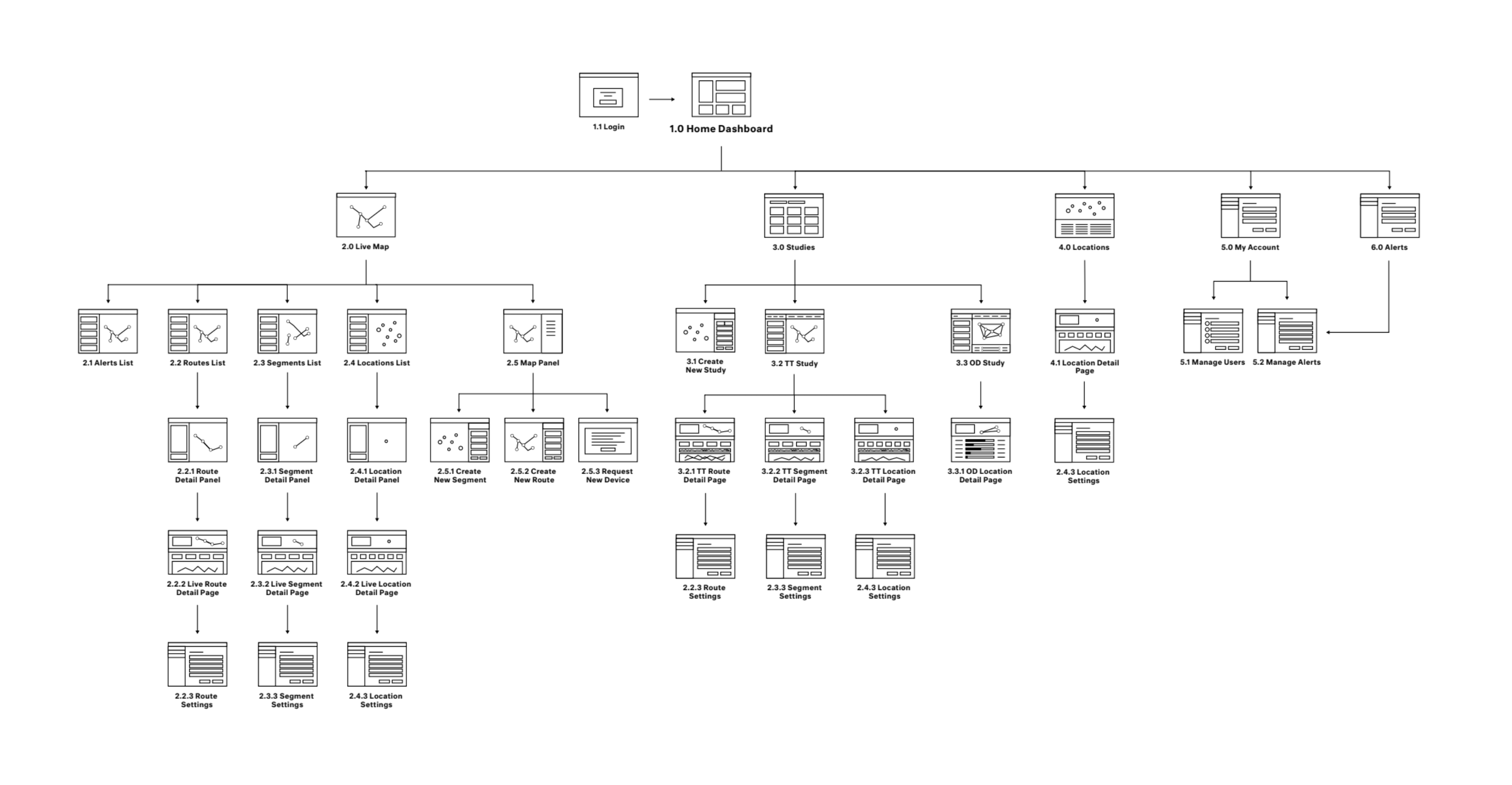 Through our research we mapped out what the complete experience would be for a BlueMac customer. This structure and flow entailed several new features and sections specific to different customer audiences. The three sections consisted of live traffic analysis, traffic studies, and sensor setup and management. With limited budget and time we focused on live traffic analysis and sensor setup and management for the upcoming design and development sprints.