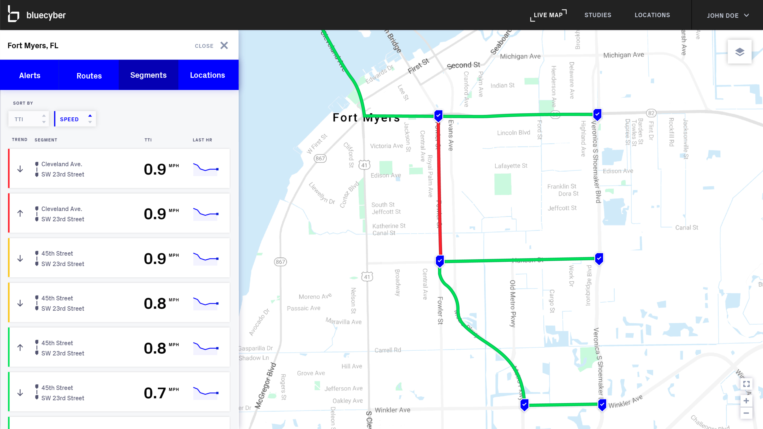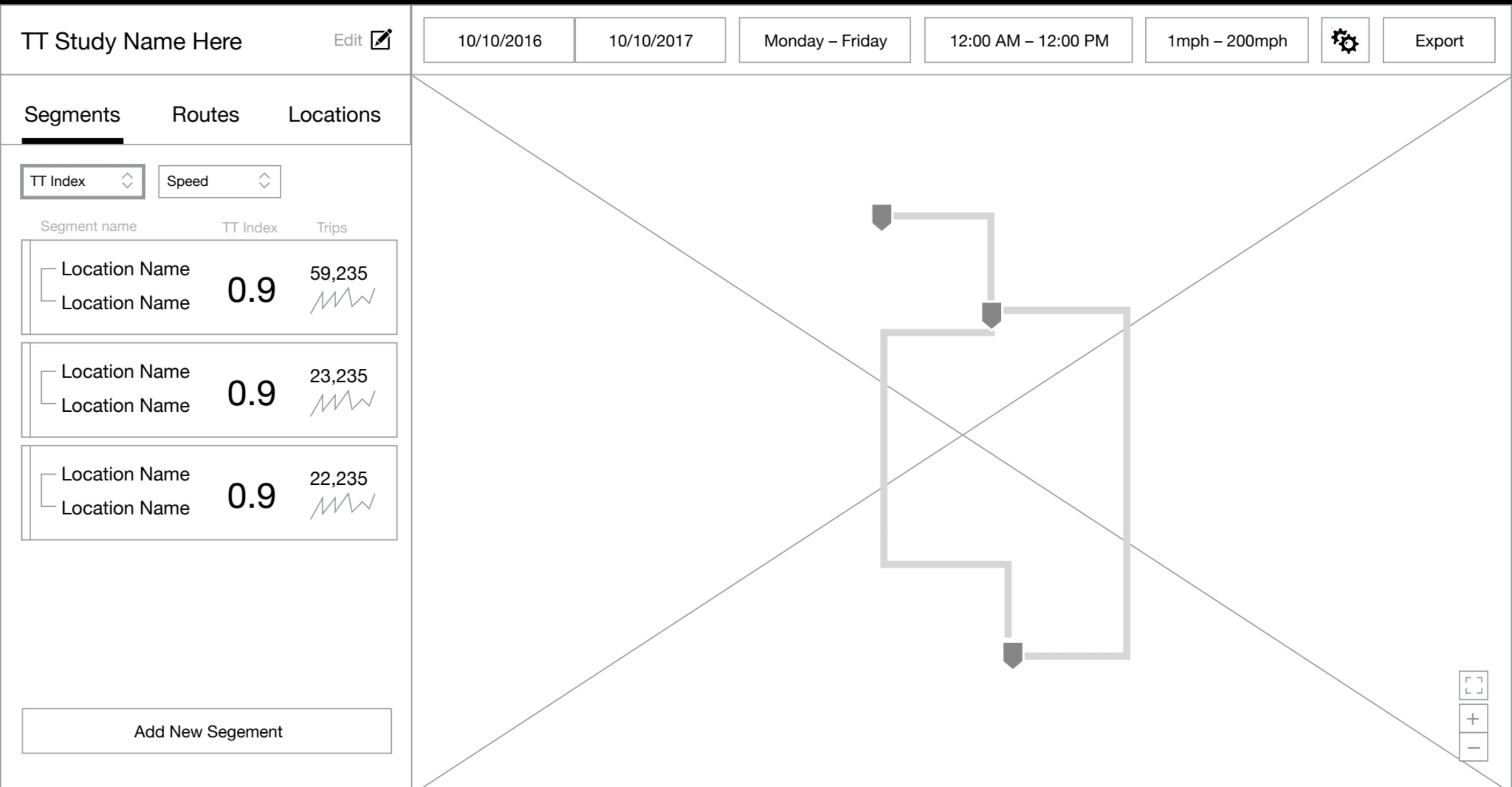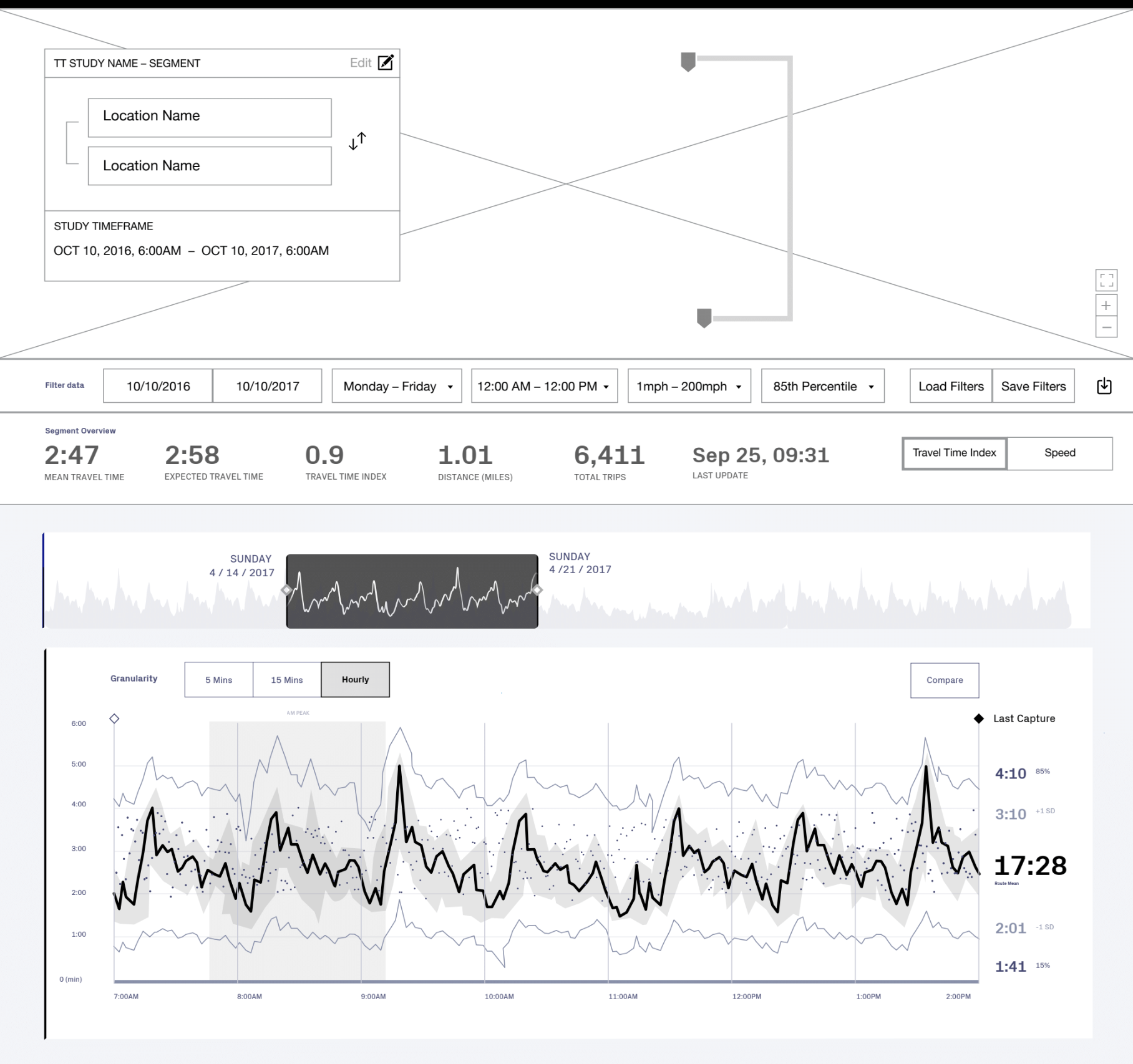 We created a map based interface where the user could not only see what traffic flows and corridors are being tracked, but can also directly interact with the sensors, routes, and segments to discover new insights and easily troubleshoot any issues.