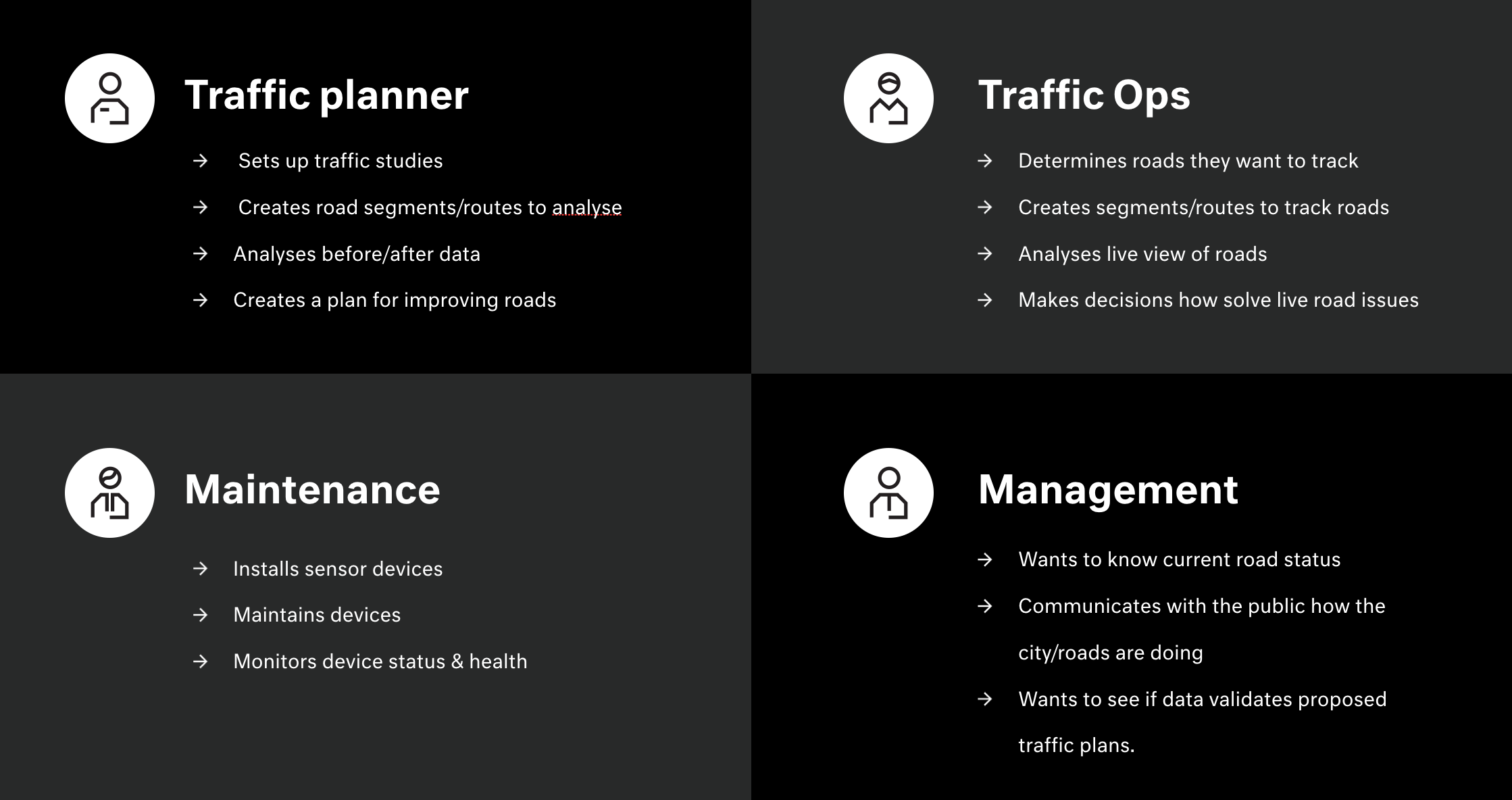 The existing tool only provided basic monitoring, was highly restricted by the technology platform, and lacked many of the features that were crucial to the target audience. Through a series of interviews with traffic engineers, traffic controllers, and city planners, we gained a better understanding of their day-to-date activities, needs, pain points, and mapped opportunities for future improvements to the tool.
