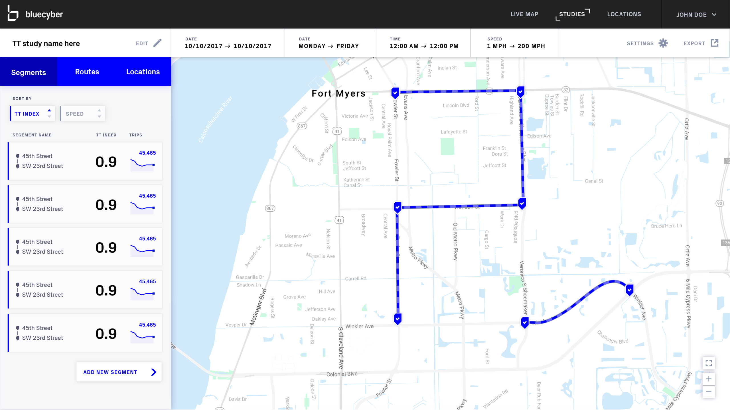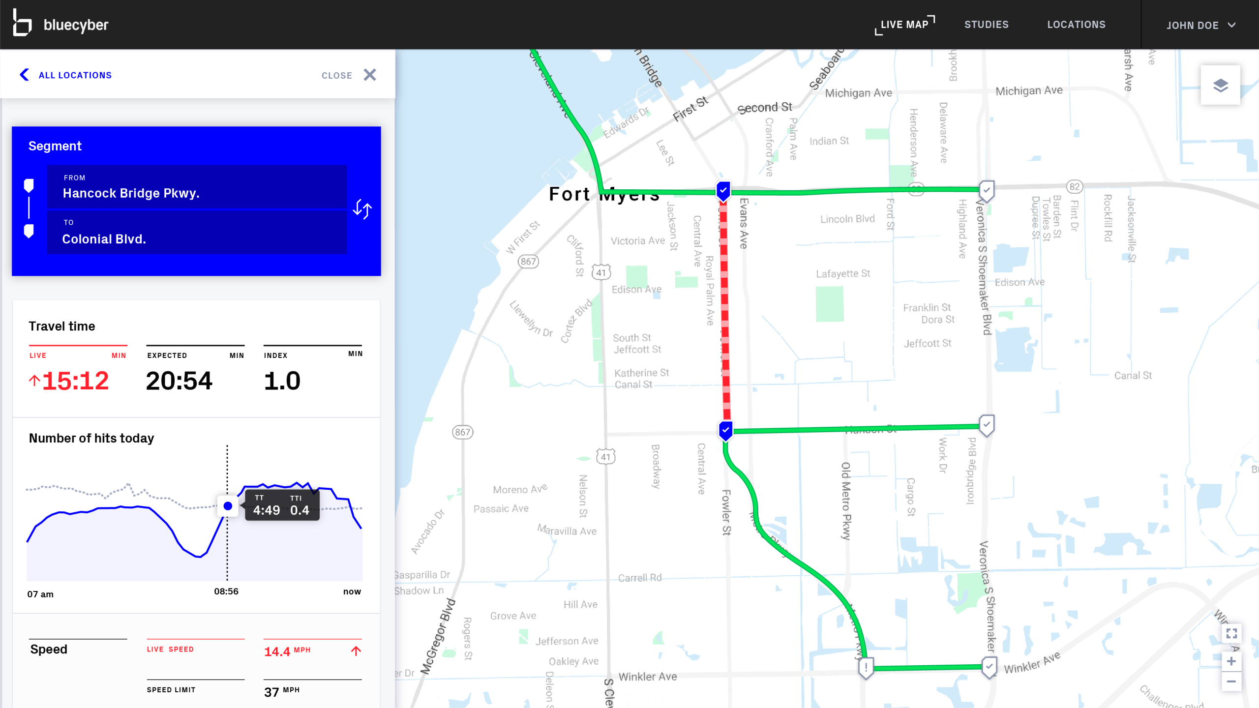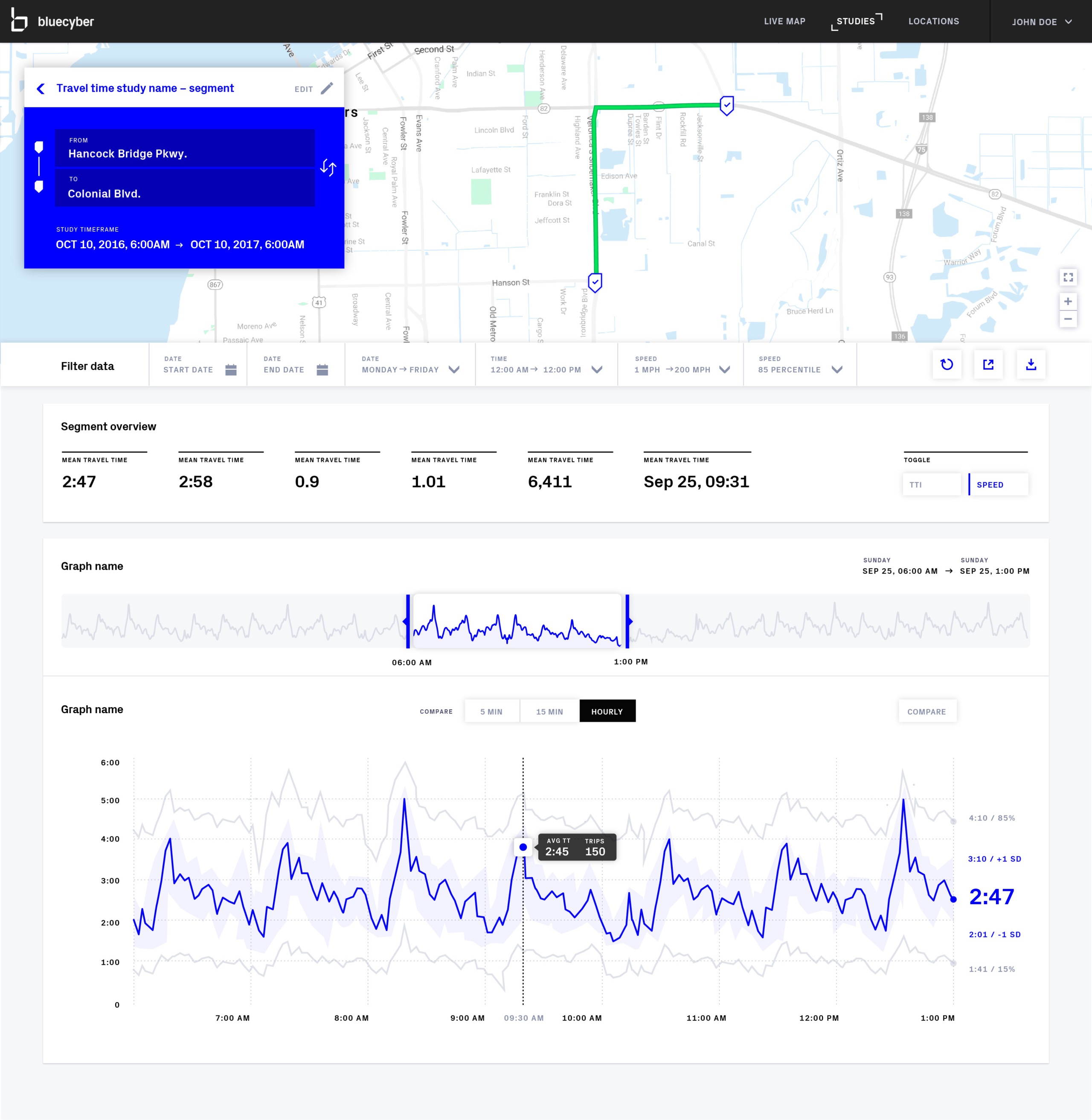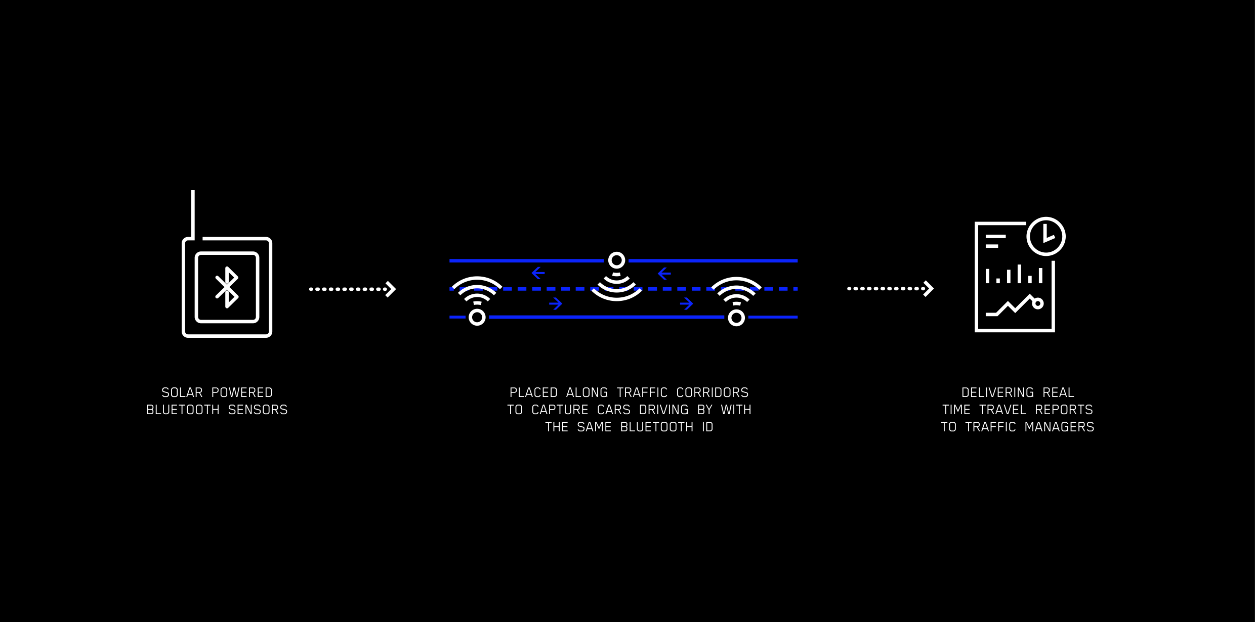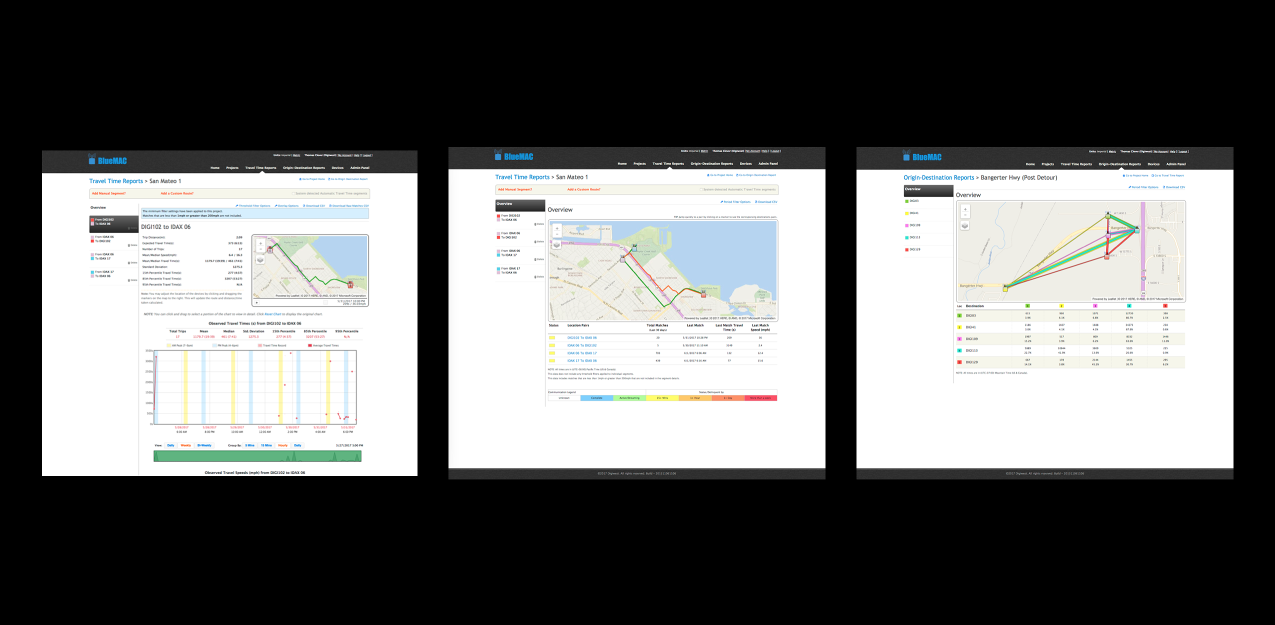 capture the MAC address of passing cars via the devices of the occupants or from the car itself. As the car travels through different traffic corridors, multiple BlueMac sensors register the same device and are able to show the travel time of the vehicle. We used anonymized data from BlueMac's API to build a front-end application to empower traffic controllers to see travel times and a variety of other metrics in real-time.