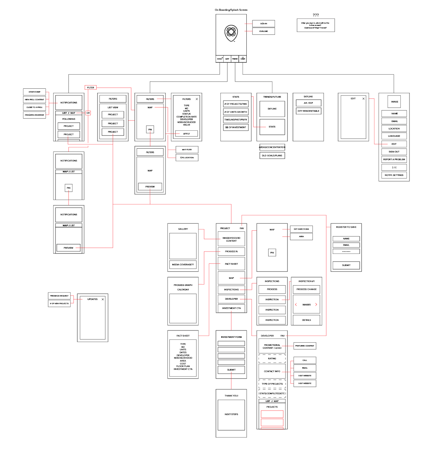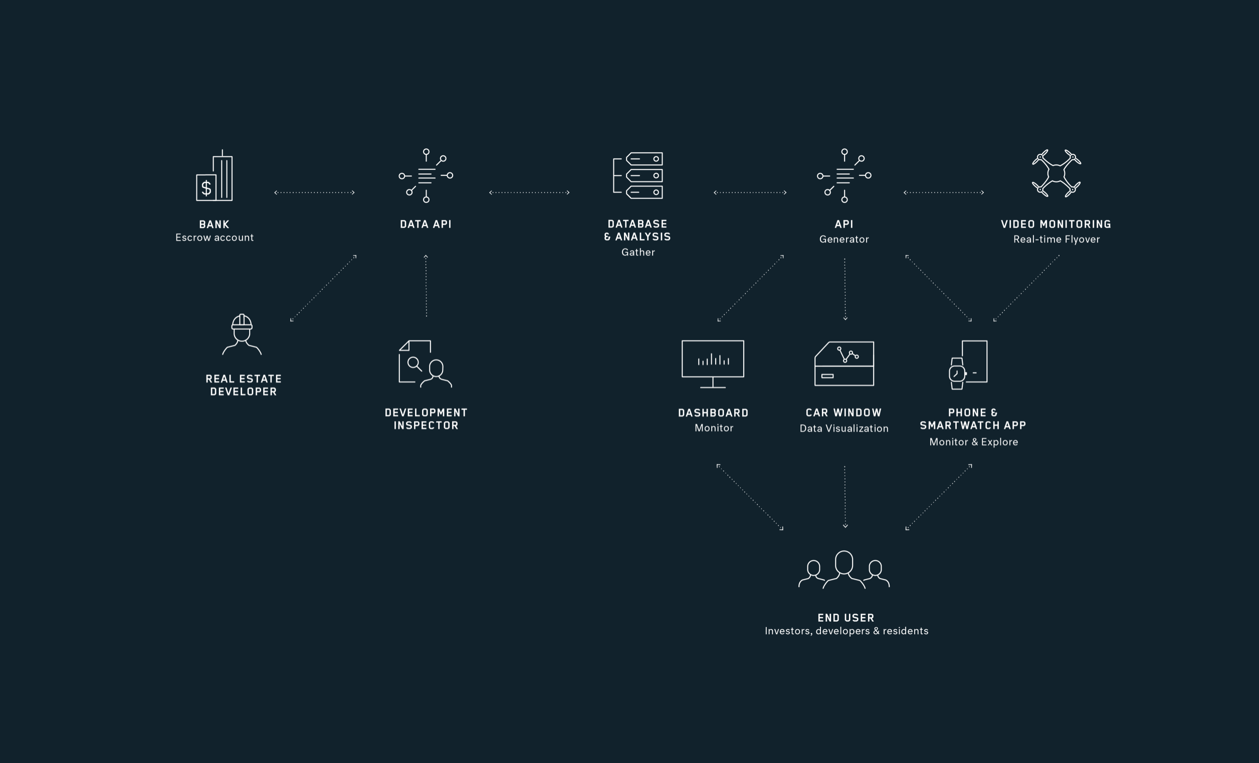 We mapped out the structure of the platform and how each touchpoint would connect users and provide relevant real estate data. The platform would gather and centralize financial, planning, construction, and inspection data and through an API would supply the data and content to a variety of application and experiences, starting first with a mobile app.