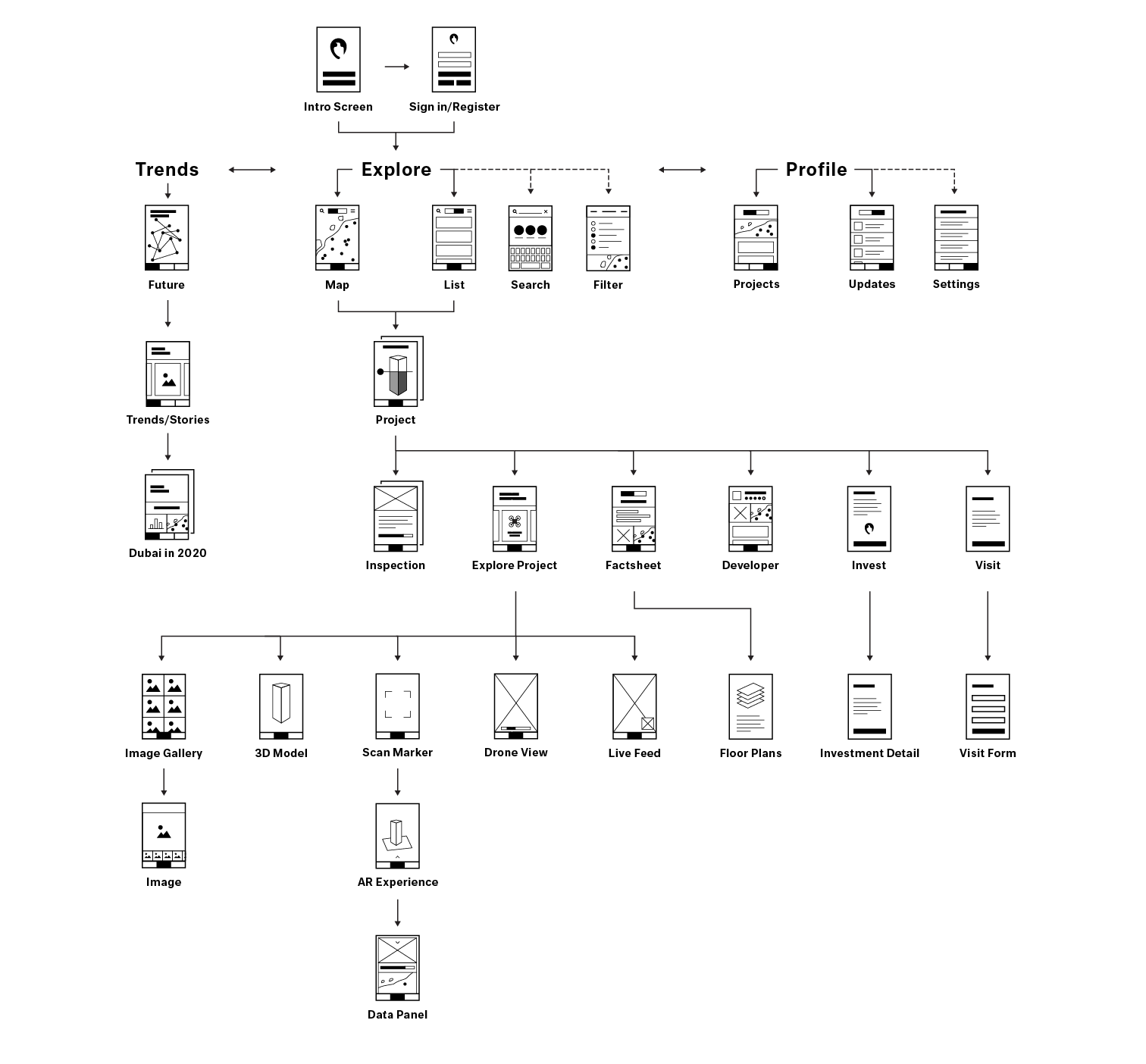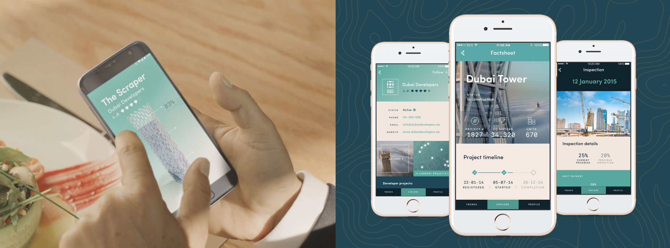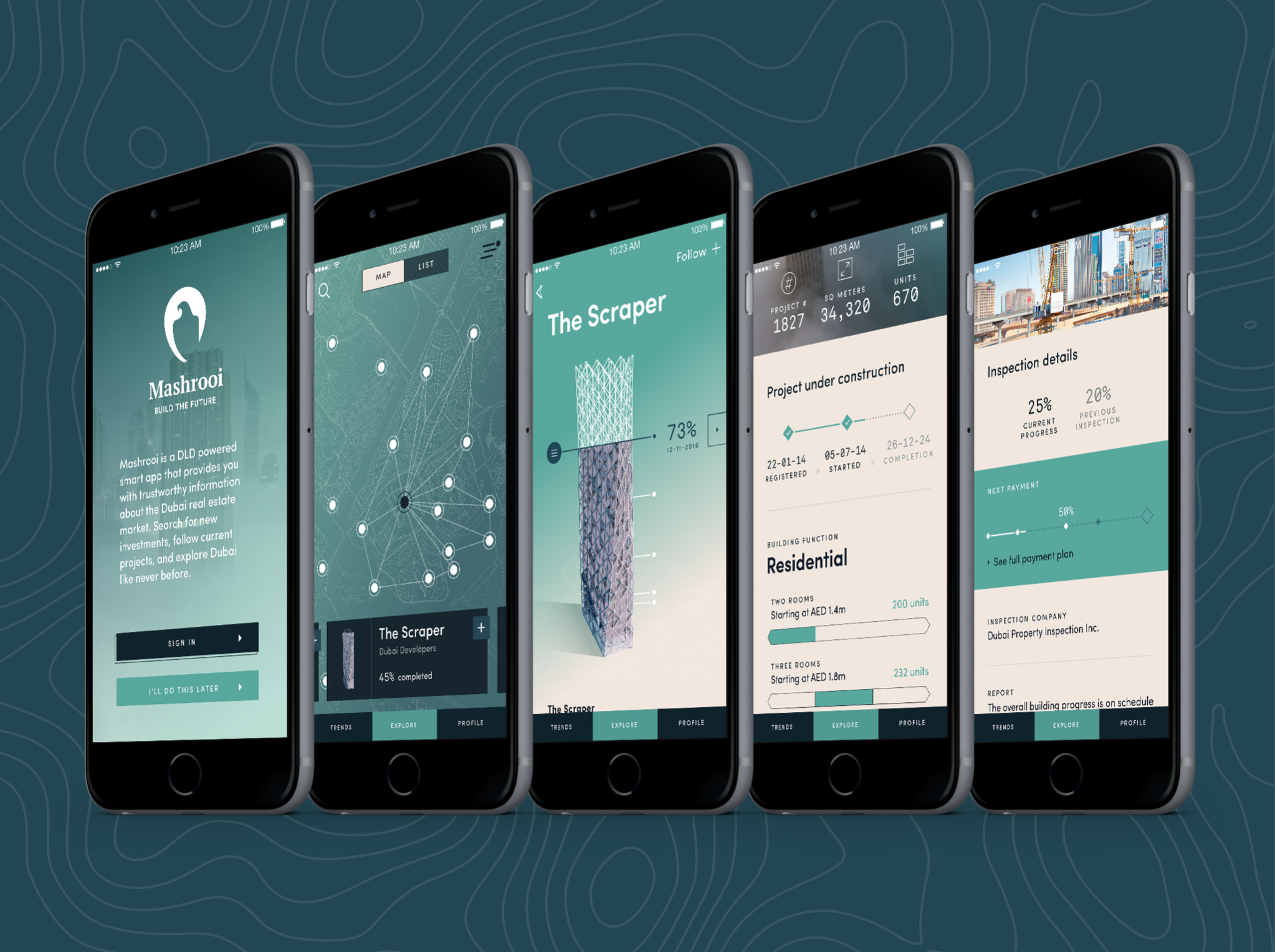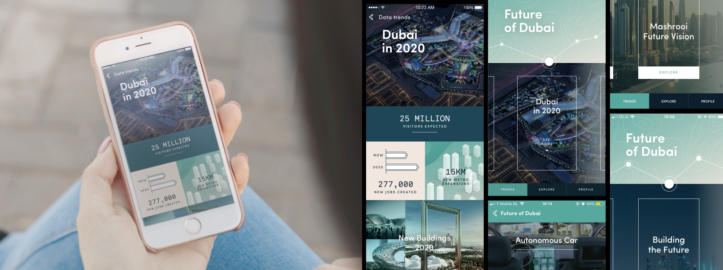Alongside the data analysis and UX design of the application we explored concepts for how the app should look and the overall experience it would provide. We used architectural and natural elements unique to the landscape and cityscape of Dubai to provide the basis for the visual concept.
